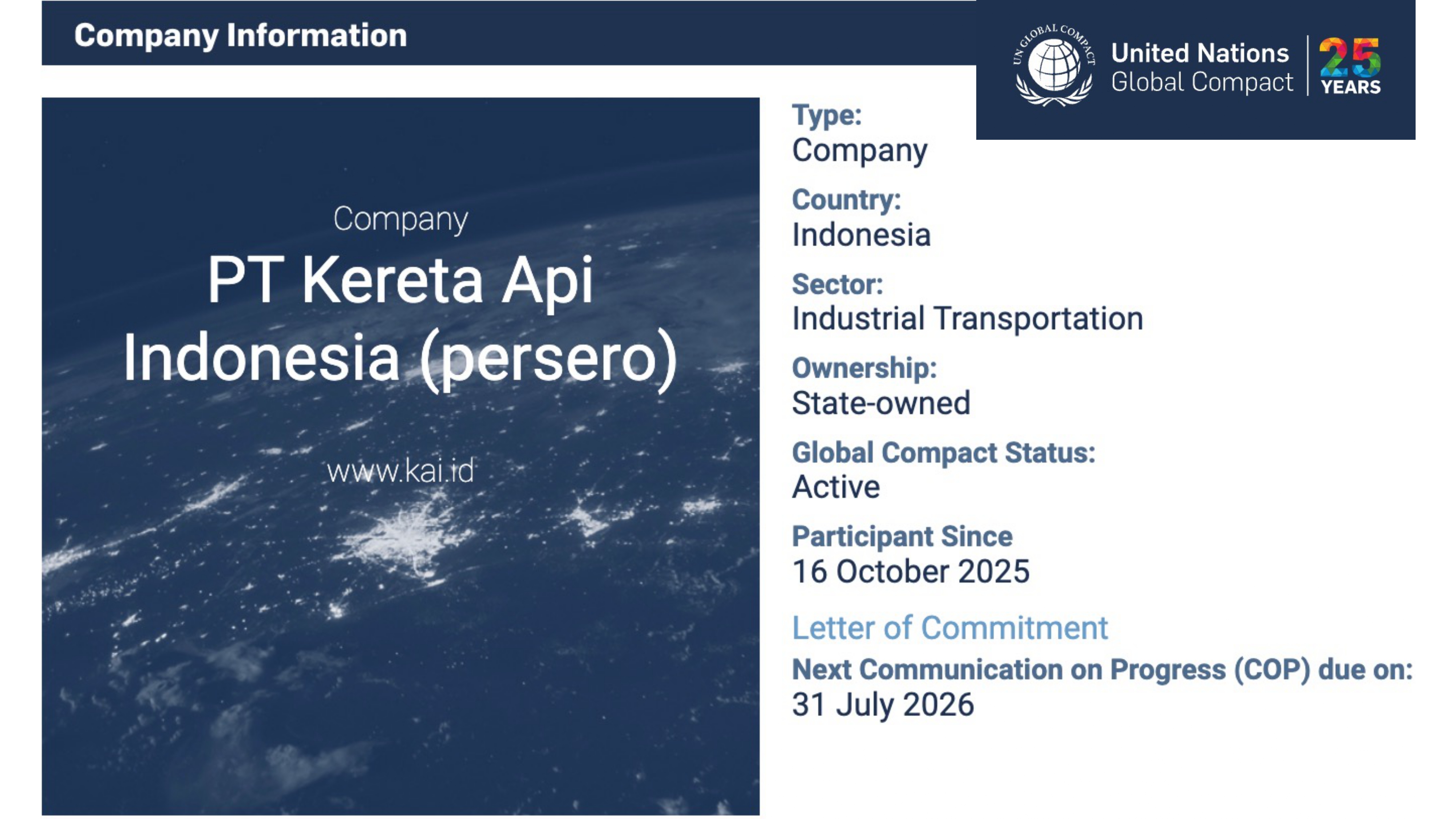| 1. | UNGC (United Nations Global Compact) dan UNFCCC (United Nations Framework Convention on Climate Change) | Mendukung bisnis untuk mengadopsi prinsip-prinsip keberlanjutan dan mendorong aksi iklim global. | Sangat Sesuai. Mendukung kerangka kerja iklim global, dekarbonisasi, dan keterlibatan sektor swasta. | KAI aktif berpartisipasi dalam diskusi dan forum untuk mengidentifikasi peluang kolaborasi dalam mengatasi tantangan iklim, sebagai anggota United Nations Global Compact (UNGC). |